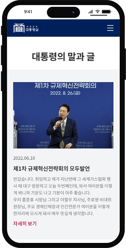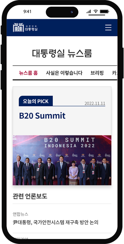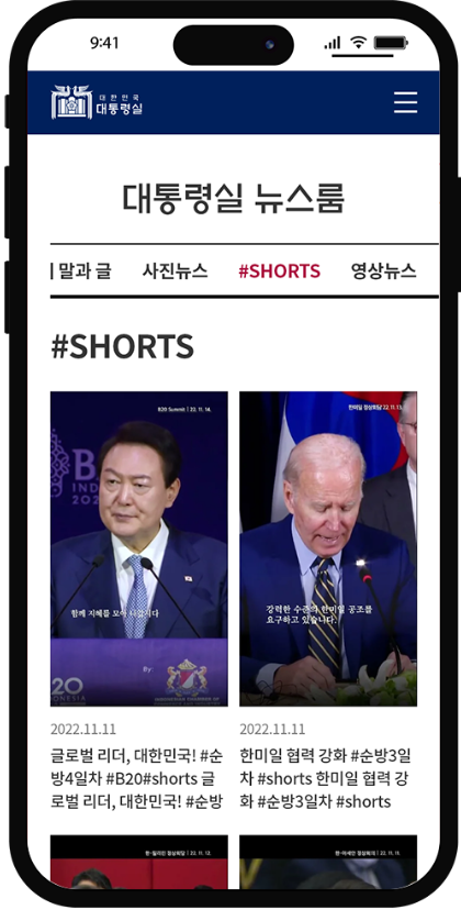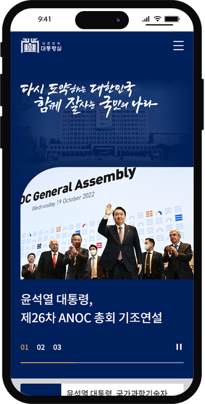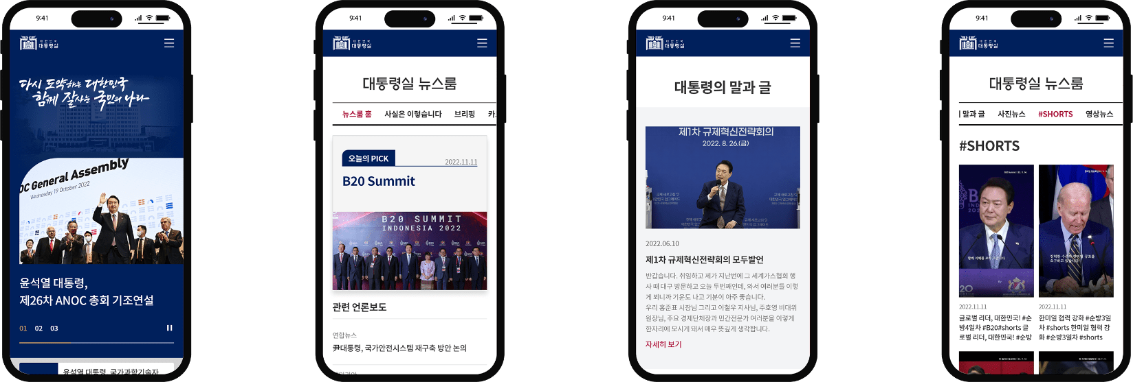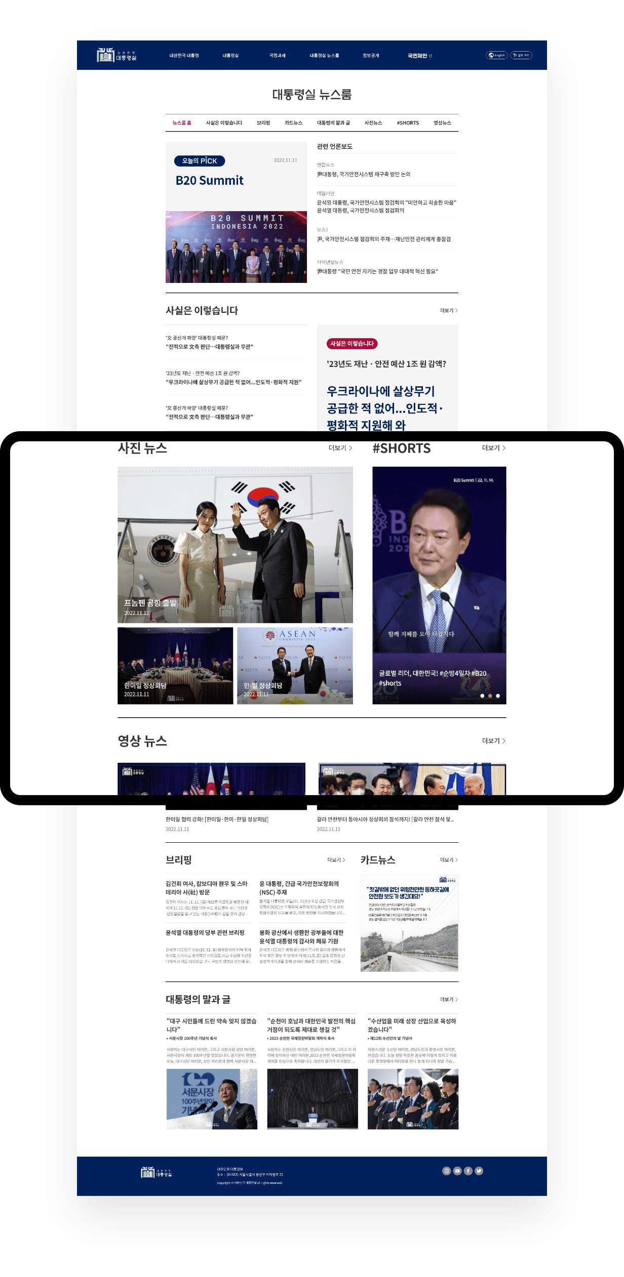 2022년 새 정부 출범 이후 임시로 구축된 대통령실 국문 및 영문 공식 홈페이지를 전면 재구축하여 본격적인 대국민 소통을 위한 기반을 마련하였습니다. 바뀐 상징체계에 맞게 새롭게 디자인하였고, 대통령실이라는 품격과 위상을 유지하면서도 국민에게 친근하게 다가갈 수 있도록 세련되고 부드러운 디자인으로 구현하였습니다. 보안 부분 역시 국가최고 안보기관인 만큼 최고수준의 보안과 성능을 확보하도록 개발하였습니다.